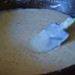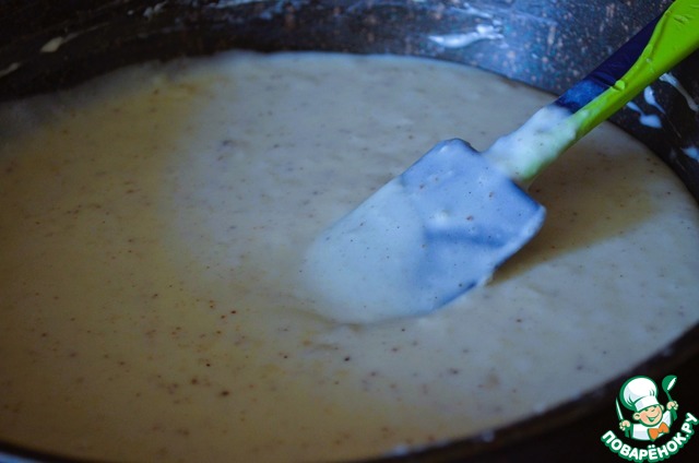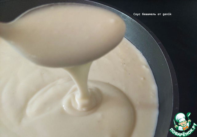 Постепенно вливаем молоко (теплое или комнатной температуры, чтобы избежать термического шока). Варим 5 минут на медленном огне не переставая помешивать, соус должен загустеть, но имейте ввиду, что когда он остынет, будет намного гуще, чем в горячем виде. Но, в крайнем случае, можно будет развести соус теплым молоком.