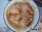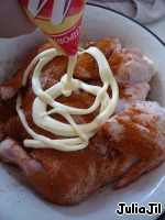 Тщательно перемазываем курицу приправой с майонезом. Даём ей так постоять хотя бы 2 часа.