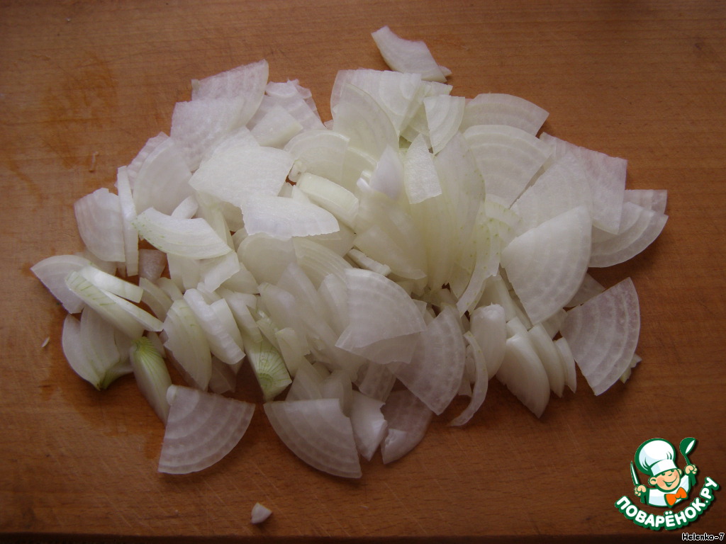 Режем лук на четыре части и нарезаем такими четвертинками-полосо чками.