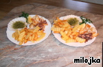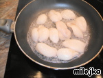 Положили жарить на сковороду до золотистого цвета (мин 5), солить не надо. Приготовили соус: выдавленный чеснок посолили, поперчили и залили маслом.