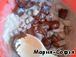 Растопленный шоколад добавить к муке и орехам.