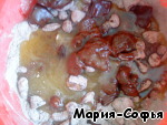 Целые орехи и порезанные сухофрукты смешать с сухими ингредиентами.