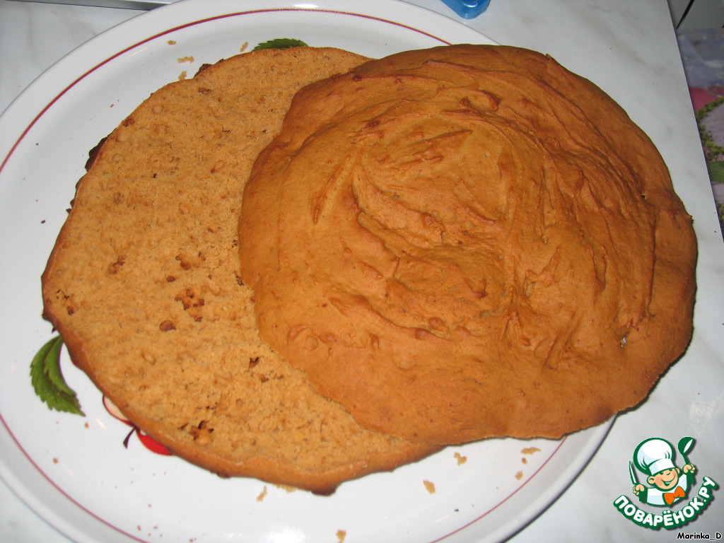 Тесто выложить в форму 26 см, выстланную бумагой (из одной нормы продуктов сделать это весьма сложно :). Выпечь корж (я пекла 25 мин. при 200 градусах, смотрите по своей плите). Достать, остудить, разрезать пополам (режется легко, несмотря на то, что он весьма непышный). -