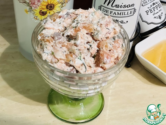 Филе лосося обжарить на сухой сковороде на среднем огне, по 3-4 минуты с каждой стороны. Остудить. Размять вилкой.