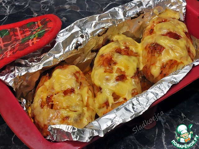 Запекать в предварительно разогретой до 200 град. духовке около 60 минут - до готовности картофеля. -