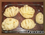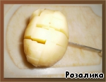 По всей длине картофеля ножом сделать надрезы, как если бы вы нарезали для картофеля фри, но не дорезая до края, приблизительно 1-2 см.
