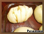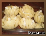 Чеснок разрезать на четыре половинки, вставить между разрезанными частями картофеля.