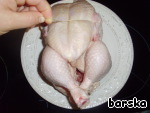 Курицу (предварительно выпотрошенную) помыть и связать ножки и крылышки.
