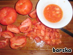 Помидоры надрезать крестообразно, ошпарить, снять кожицу, разрезать на дольки и удалить семена. Мякоть нарезать кубиками.