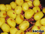 В подогретый казан выложить нарезанную грудинку и целый картофель, слегка подрумянить. -
