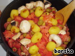 Добавить в казан шампиньоны, оливки, нарезанные помидоры. Тушить до уменьшения объёма наполовину. -