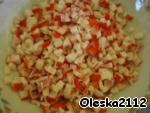Перец режем мелкими кубиками и отправляем в салатник к крабовым палочкам.