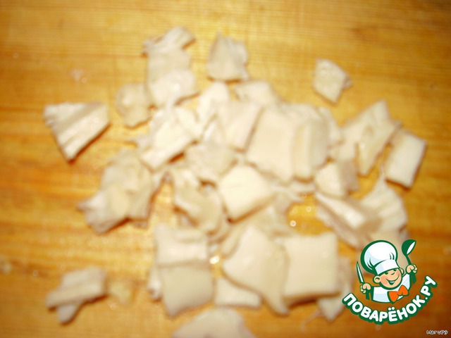 • Яйца нарежьте кубиками, смешайте с кальмарами и крабовыми палочками, добавьте икру (можно не натуральную).