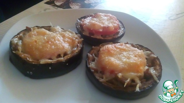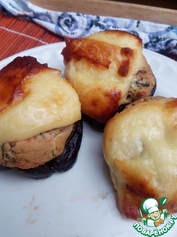 Лениво было даже делать пошаговые))) простите уж. Баклажан нарезать колечками, вырезать серединки (и порезать из мелко квадратиками). Фарш посолить, поперчить, добавить измельченный лук, смешать с баклажановыми серединками и обжарить на растительном масле до мягкости (около 10 мин). Колечки баклажанные выложить на противень, нафаршировать обжаренной массой, сверху присыпать тертым сыром