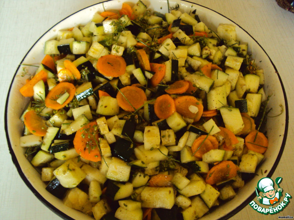 Кабачки вымыть, нарезать кубиками примерно 1*1 см, сложить в таз или кастрюлю. Морковь нарезать тонкими кружками, добавить к кабачкам. Мелко измельчить укропные зонтики. В оригинале добавляется укроп. Но, во-первых, когда вырастают кабачки, укропной зелени уже нет. Во-вторых, зонтики гораздо ароматнее. Добавить соль, сахар, чеснок, перец, уксус, растительное масло. Все тщательно перемешать и оставить на 3 часа.