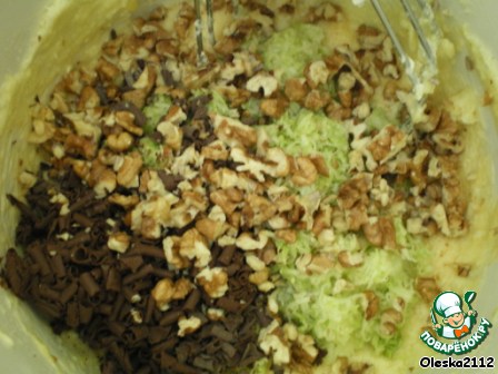 Добавляем в массу кабачок, тёртый шоколад (или шоколадную стружку) и измельчённые орехи. Всё тщательно перемешиваем.
