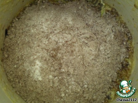 Берём блинную муку и смешиваем с какао (лучше вместе просеять через сито). Высыпаем нашу сухую смесь во взбитую массу. Всё тщательно перемешиваем.