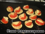 Баклажан режем толщиной примерно 0,7 см. и укладываем на смазанный противень и на них слой фарша.