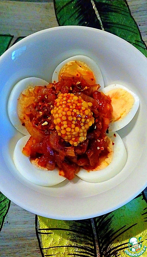 Остывшие яйца порезать на 4 части и выложить на блюдо. (я выложила на две плоские тарелочки)
