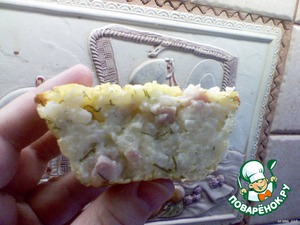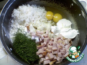 Смешать между собой картофельное пюре (оно должно быть нежидким), рис, нарезанный кубиками карбонад, нарезанный мелко укроп, яйца, сметану, разрыхлитель, муку, добавить соль по вкусу.