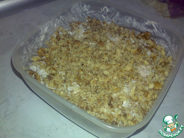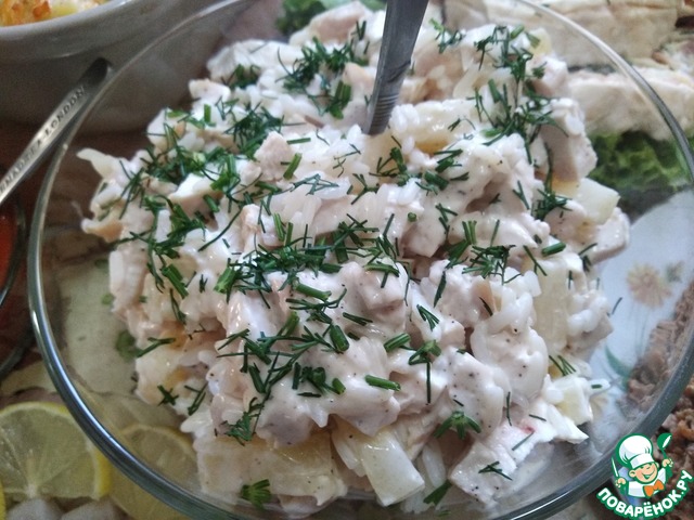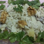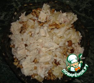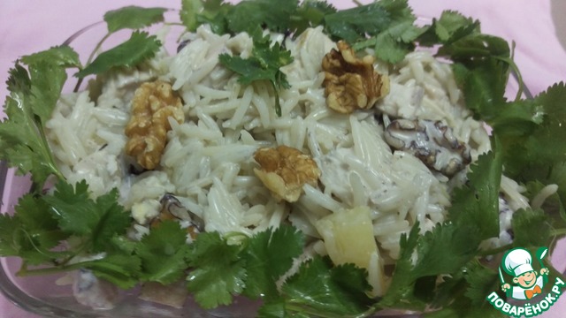 Рисовый салат с курицей, ананасом, лимонным соком и грецкими орехами