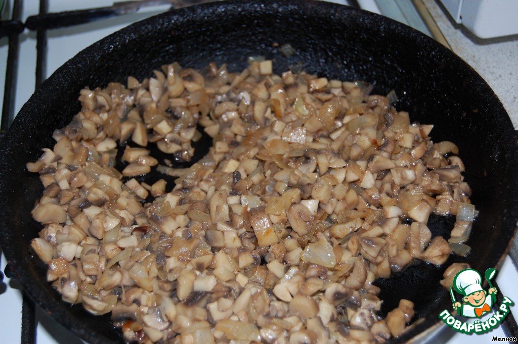 Сначала следует обжарить грибы с луком. Немного посолить.