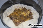 Выложить в основу слой курицы, слой грибов и залить все яйцами.