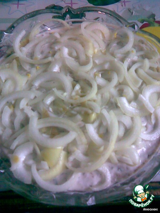 Лук режем полукольцами и маринуем (по 3 ст. л. уксуса, сахара, воды и 1 ст. л. соли)