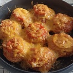 По рецепту оставшиеся две луковицы надо мелко нашинковать и посыпать ими котлеты. Далее смешиваем томатную пасту с тремя ложками горячей воды и смазываем этим соусом биточки. Сверху надо положить кружочки очищенных от кожицы помидоров. -