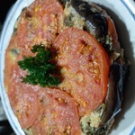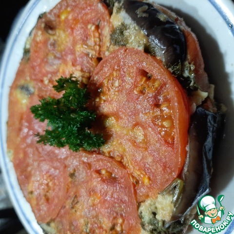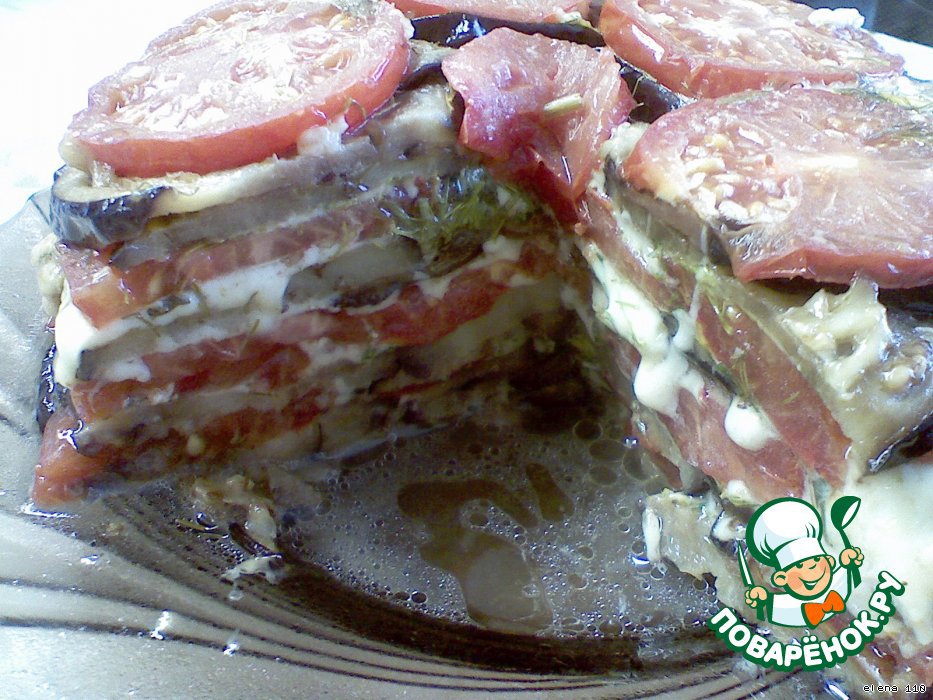 На самое дно формы выкладываем слоем помидоры, солим, посыпаем зеленью, сыром и чесноком, дальше кладeм слой баклажанов.