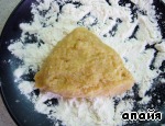 Сформировала Крокеты в форму. Форму можно делать любую по вашему усмотрению, а я их сделала в виде треугольников и обваляла в муке.