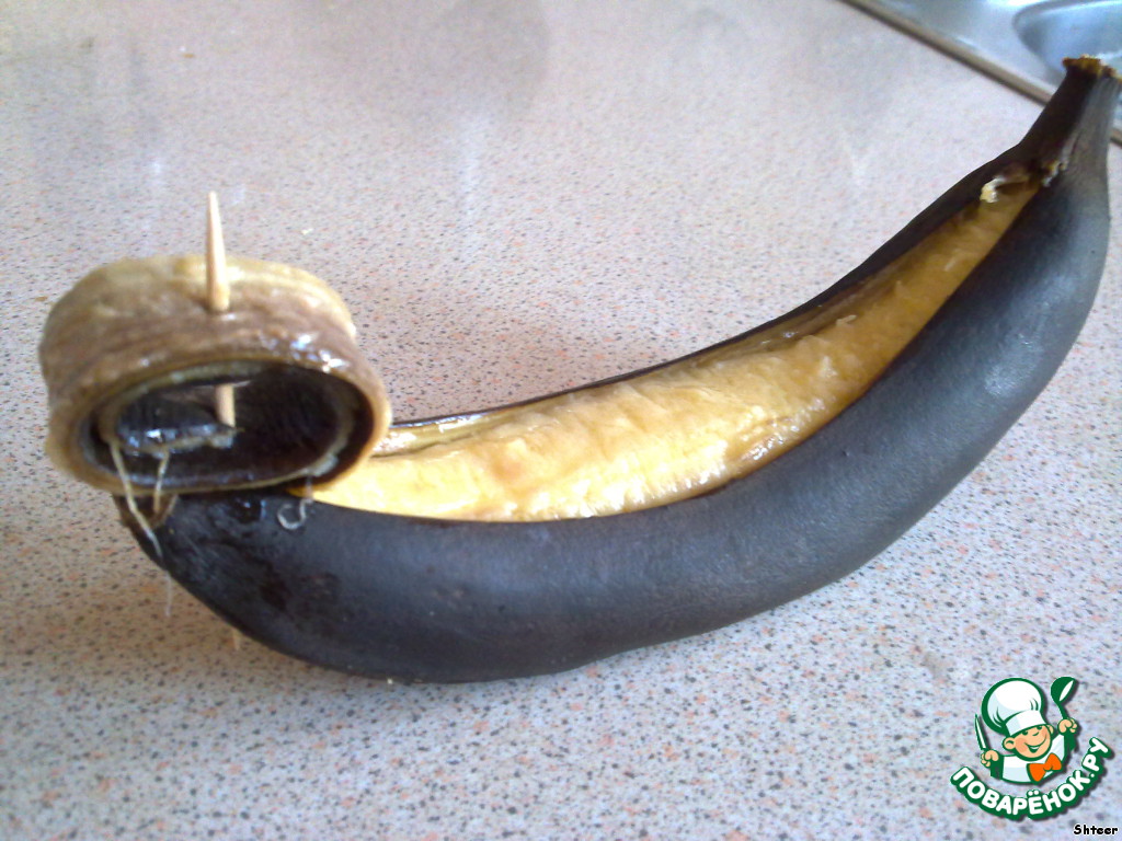 Нам потребуется 4 банана. Они должны спелыми и в то же время достаточно плотными (иначе они расквасятся при запекании). Положить бананы на противень и поставить в разогретую до 160-180 градусов духовку. Время выпекания 20-30 минут - пока кожура банана не станет темно-коричневой.