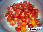 Помидоры разрезать пополам, крупные на 4 части. Помидорчики лучше взять не очень спелые, потому что спелые при варке разваливаются.