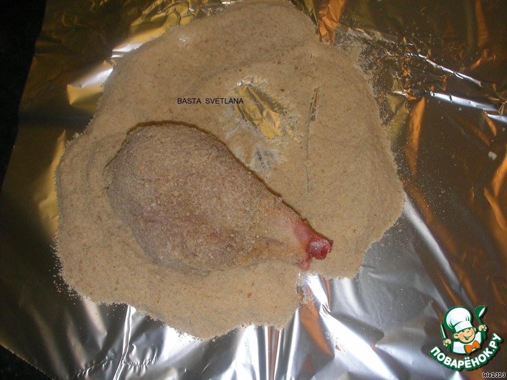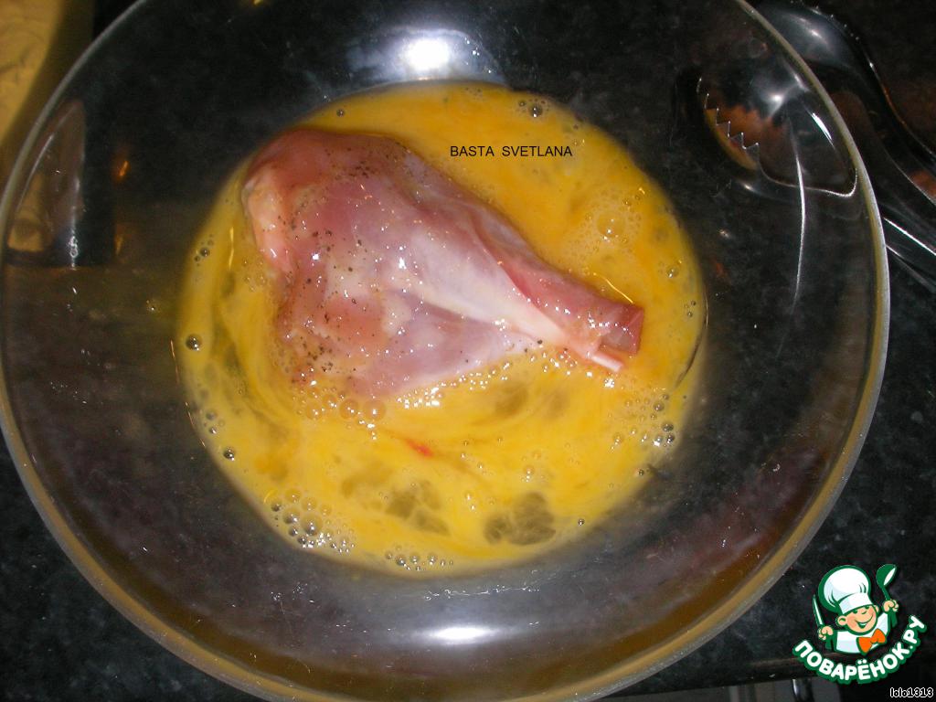 Для образования хрустящей корочки голени обвалять в панировочных сухарях, предварительно обмакнуть их во взбитое яйцо.