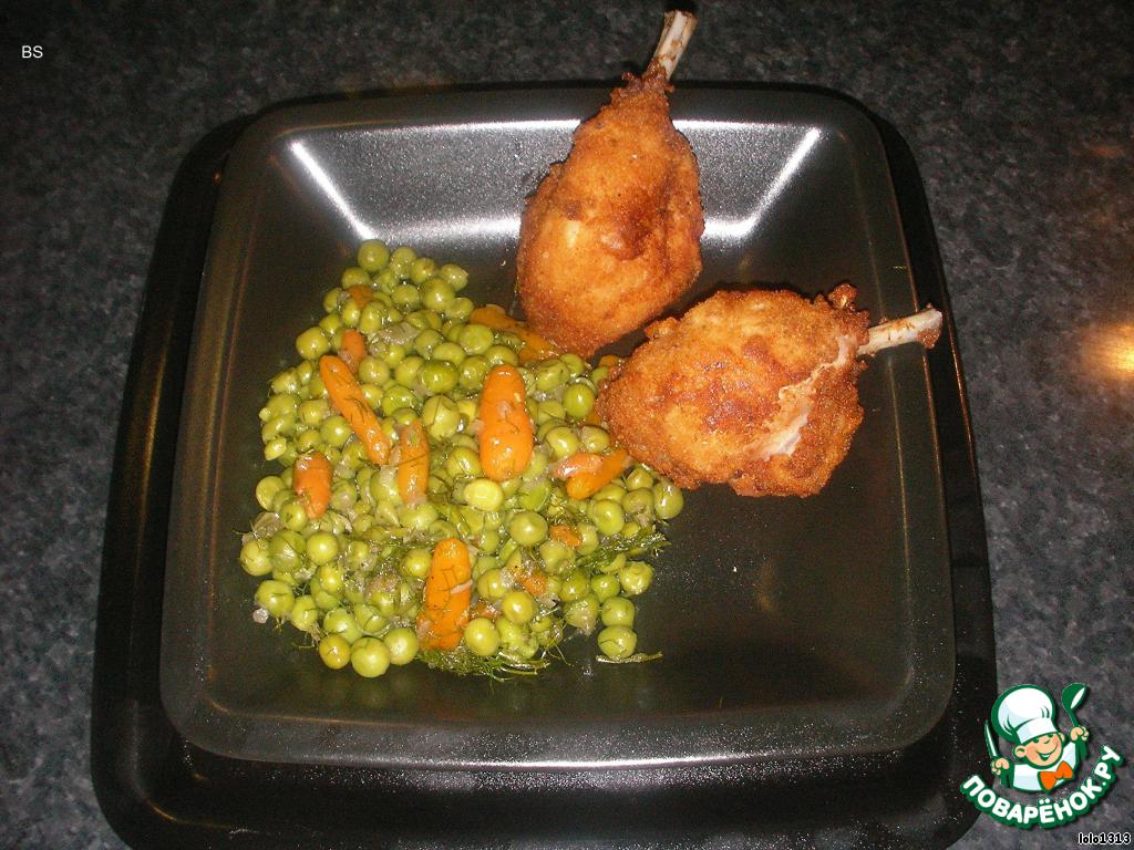 Очень простой и вкусный гарнир из зелeного горошка к куриным голеням в панировочных сухарях.