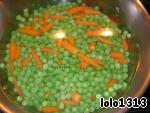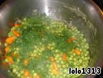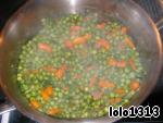 Отварить зелёный горошек с морковью до готовности. Откинуть овощи на дуршлаг.