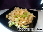 Груши очистить и нарезать кубиками. Стебли сельдерея помыть и нарезать (зелень отложить для украшения).