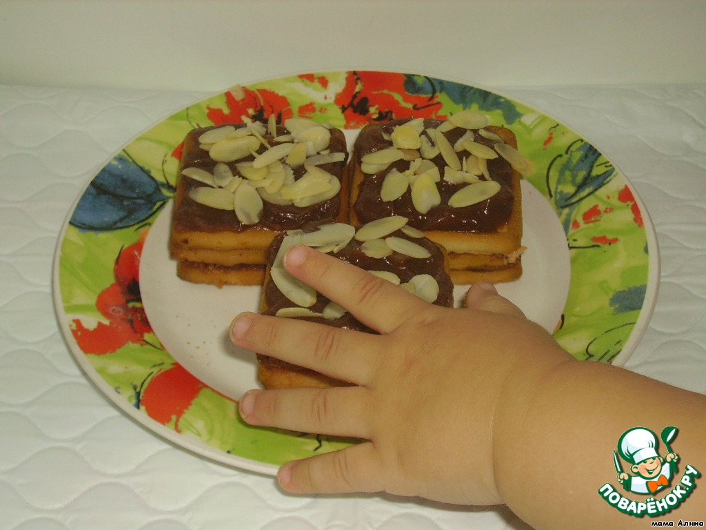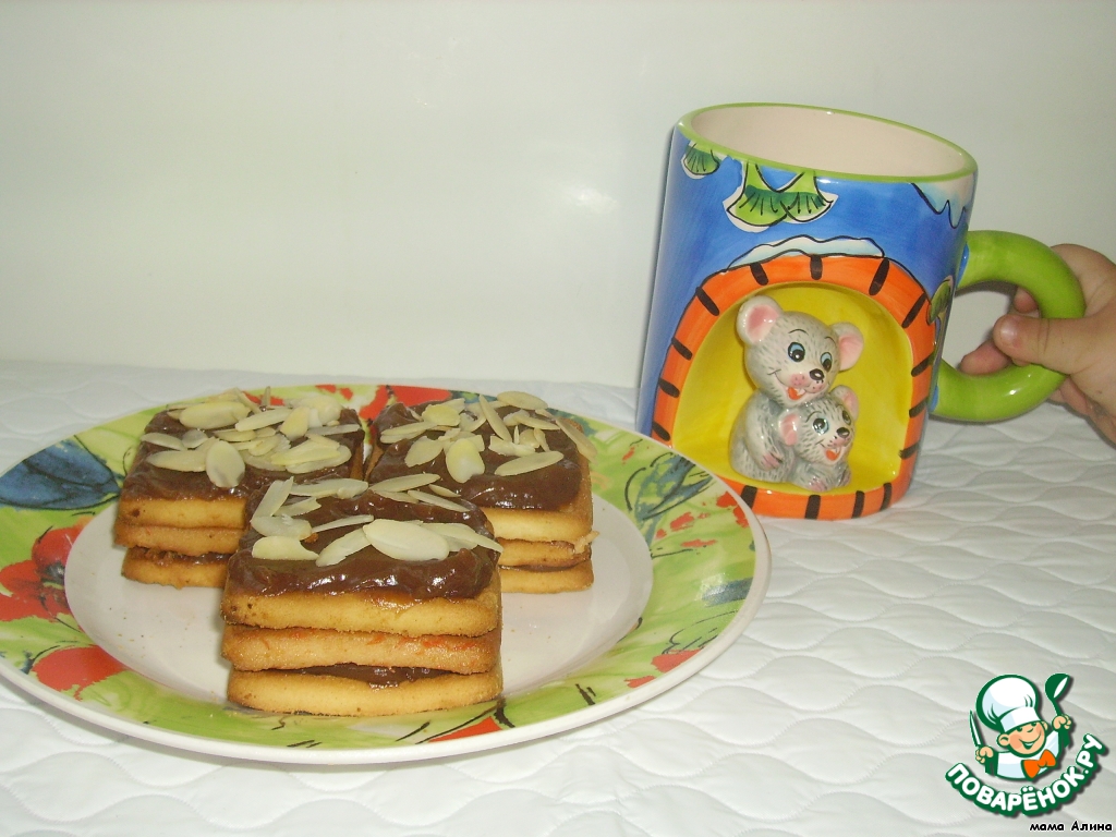 И третье печенько снова намазать шоколадной пастой и присыпать миндалем! -