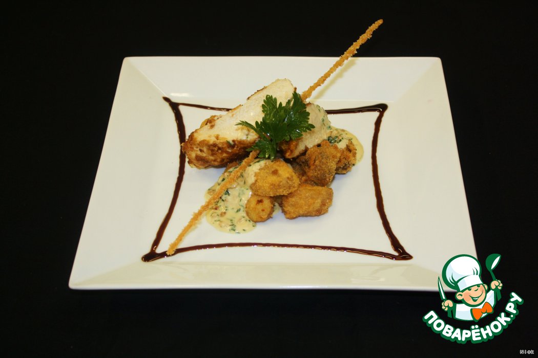 Куриная грудка в стружке из тунца с картофелем и соусом из эстрагона. Эстрагон можно заменить на тархун