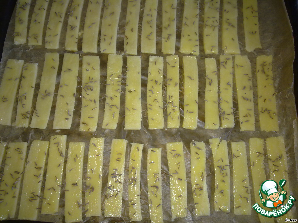 Раскатать тесто тонким слоем около 1мм. Нарезать в виде палочек.