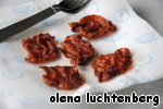 Тонко нарезанный бекон поджарить до хрустящего состояния и выложить на кухонные бумажные салфетки, чтобы излишний жир впитался.