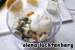 Для заправки измельчить в блендере 3/4 сыра, йогурт, горчицу, сок половины лимона, очищенные зубок чеснока и небольшую луковицу-шалот. Ни соль, ни перец не понадобятся. Должна получиться относительно однородная масса.