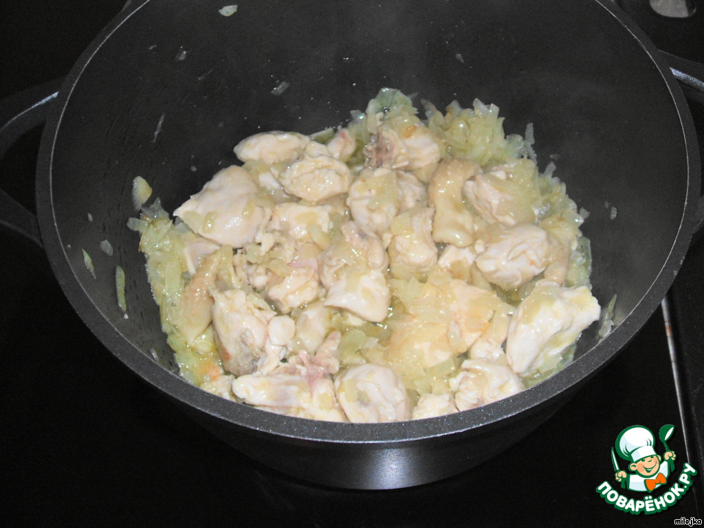 Добавить нарезанное мясо (куриные грудки нарезать на мелкие кусочки 1x2 cm) и перемешивать мясо, пока не станет белым