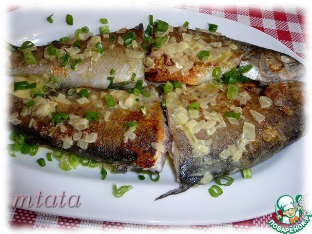 Форель выложить на блюдо и полить соусом, посыпать мелко нарезанным зелёным луком-резанцом.