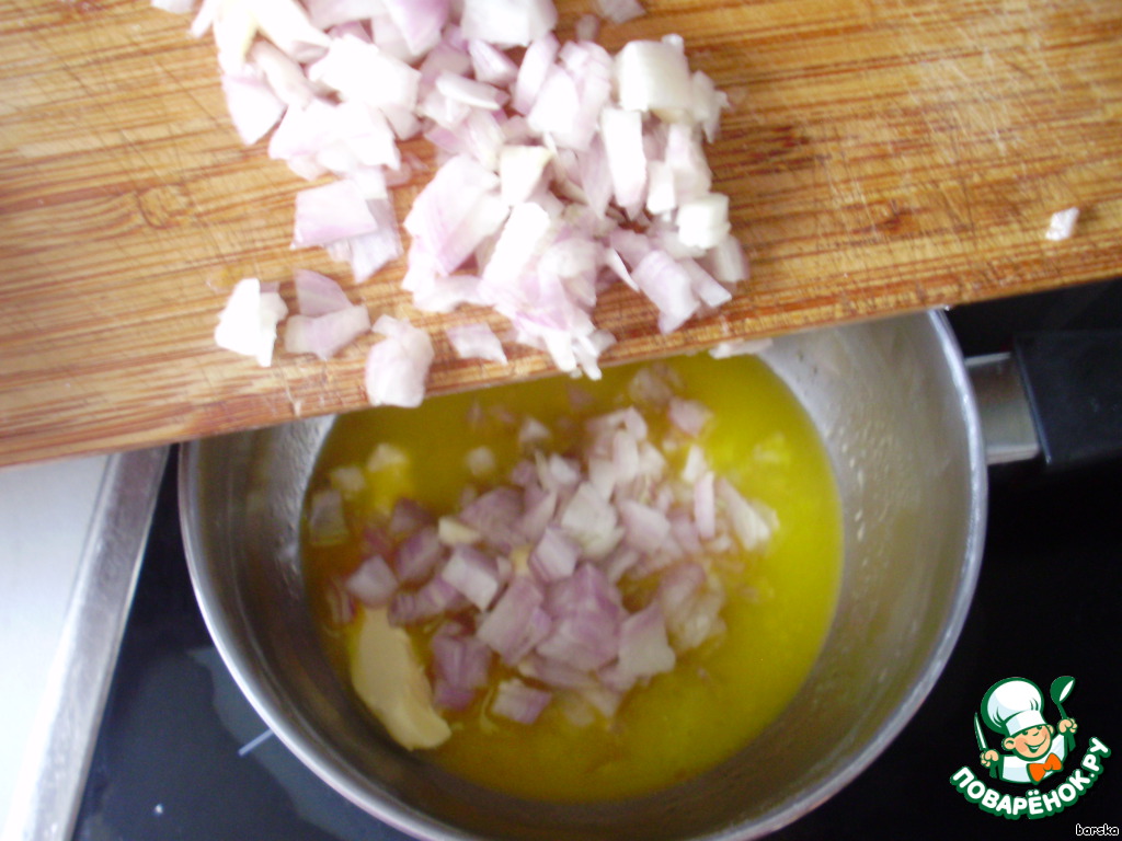 В сотейнике растопить сливочное масло и добавить мелко нарезанный лук-шалот. Тушить до прозрачности. -