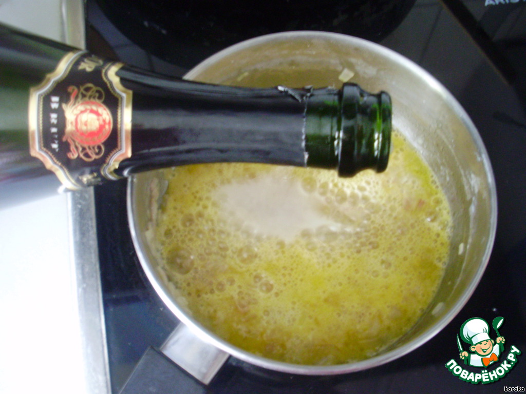 - Шампанское (игристое вино брют или сухое белое вино) — 200 мл