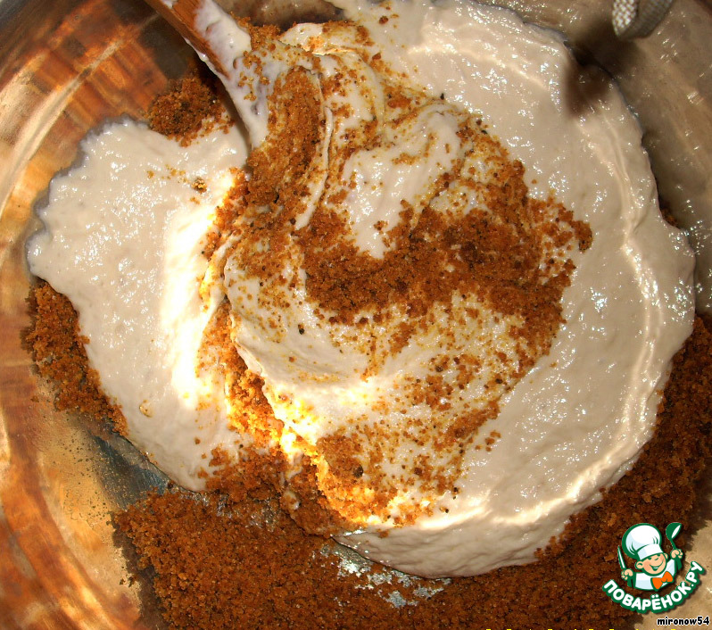 Домешиваем в наш «золотой», с ароматом карамели, основной компонент теста заранее приготовленную дрожжевую опару,