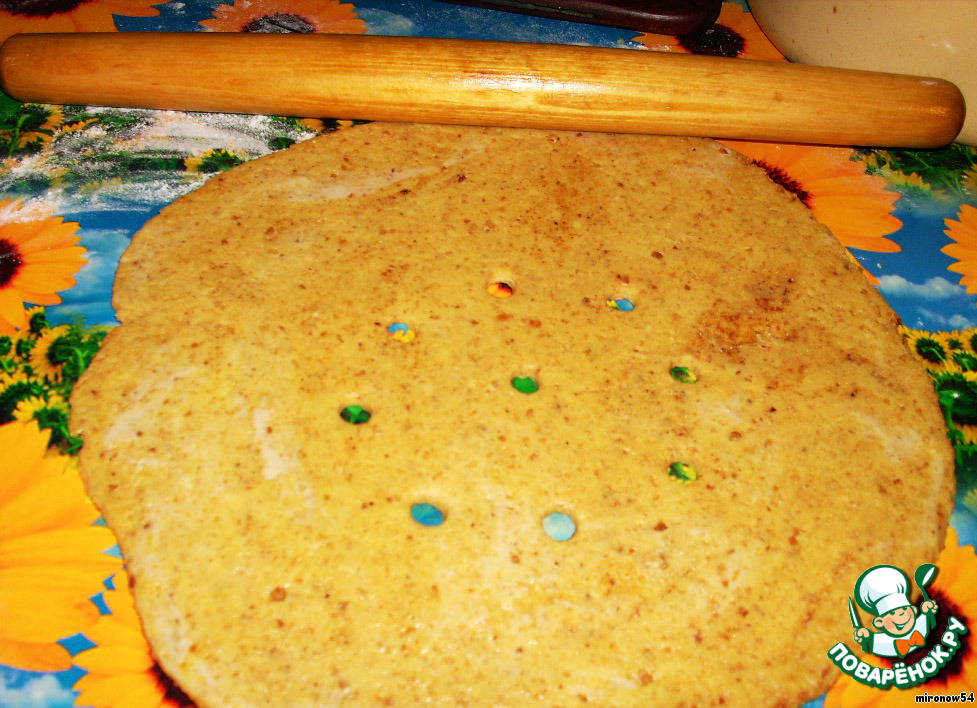 Второй пласт тоненько раскатываем, делаем по центру несколько небольших отверстий…
