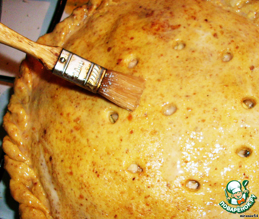 Теперь смазываем поверхность пирога взбитым яйцом, обильно посыпаем кунжутом, либо другой ореховой присыпкой и ставим наш пирог в разогретую духовку.
