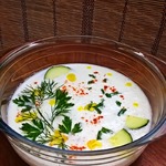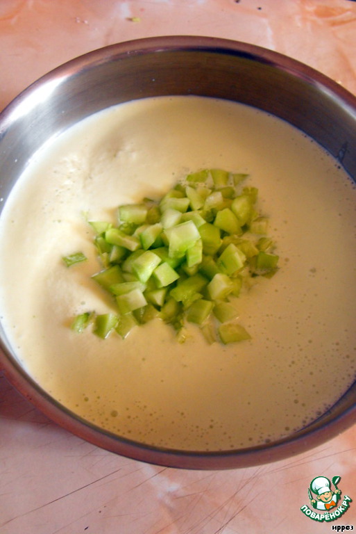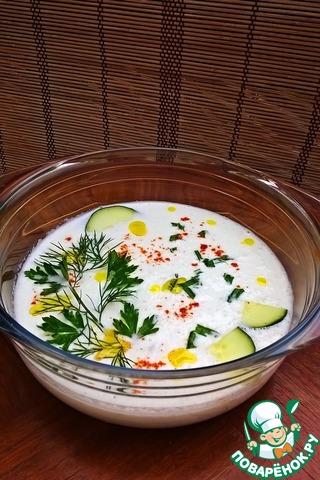 Положить в суп отложенные кусочки огурца, перемешать, убрать в холодильник минимум на 2 часа.